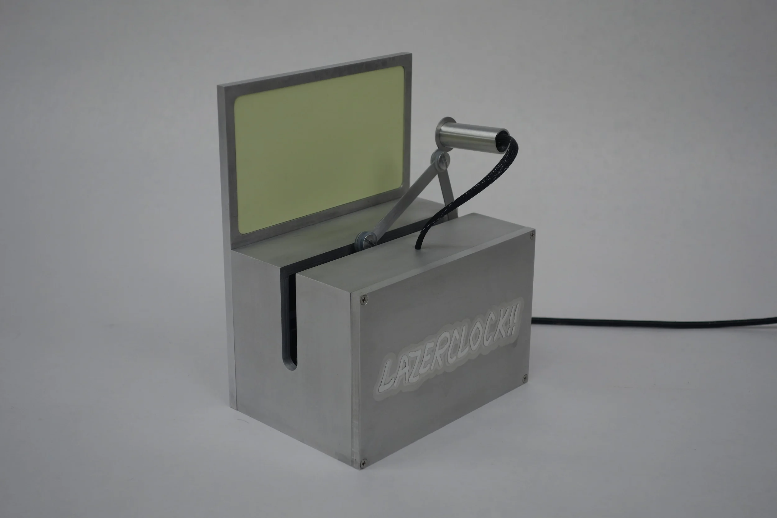 The Lazerclock!! is my project designed and built for Stanford's ME203 class. It's a real clock. It uses a 5mW 405nM laser to write the time on a photosensitive vinyl. The arms are controlled by two (hidden) servo motors, which are in turn controlled by an Arduino Pro Mini. The whole casing is machined out of quarter-inch aluminum, and the logos on the front/back are made with glow-in-the-dark powder coating.
